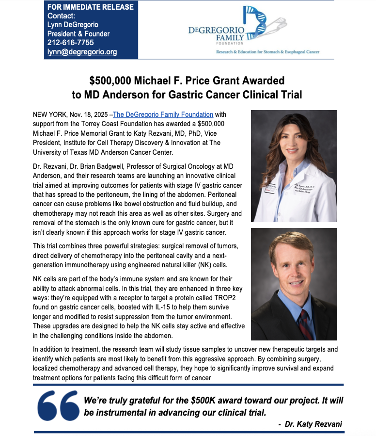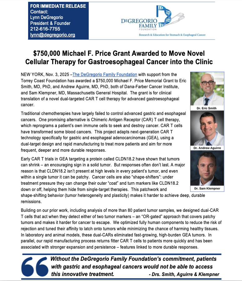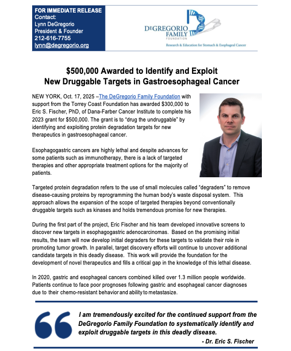 The DeGregorio Family Foundation in partnership with the Torrey Coast Foundation is pleased to announce an RFA for up to $2 million for existing or new drug development for an early phase clinical or for a late-stage research project ready for IND-enabling studies that may advance our understanding of gastroesophageal cancer and lead us to impacting patient care.